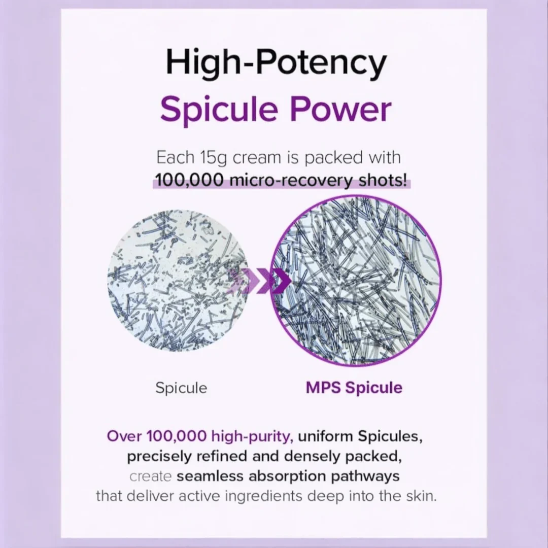 Στην καρδιά της σύνθεσης βρίσκεται ο συνδυασμός Spicule Technology, Collagen και PDRN, μια ισχυρή τριπλή δράση που λειτουργεί τόσο στην επιφάνεια όσο και στα βαθύτερα στρώματα της επιδερμίδας. Τα spicules, μικροσκοπικές φυσικές μικροβελόνες προερχόμενες από θαλάσσιο σπόγγο, δημιουργούν μικρο-κανάλια στο δέρμα, επιτρέποντας τη στοχευμένη και πιο αποτελεσματική απορρόφηση των δραστικών συστατικών.